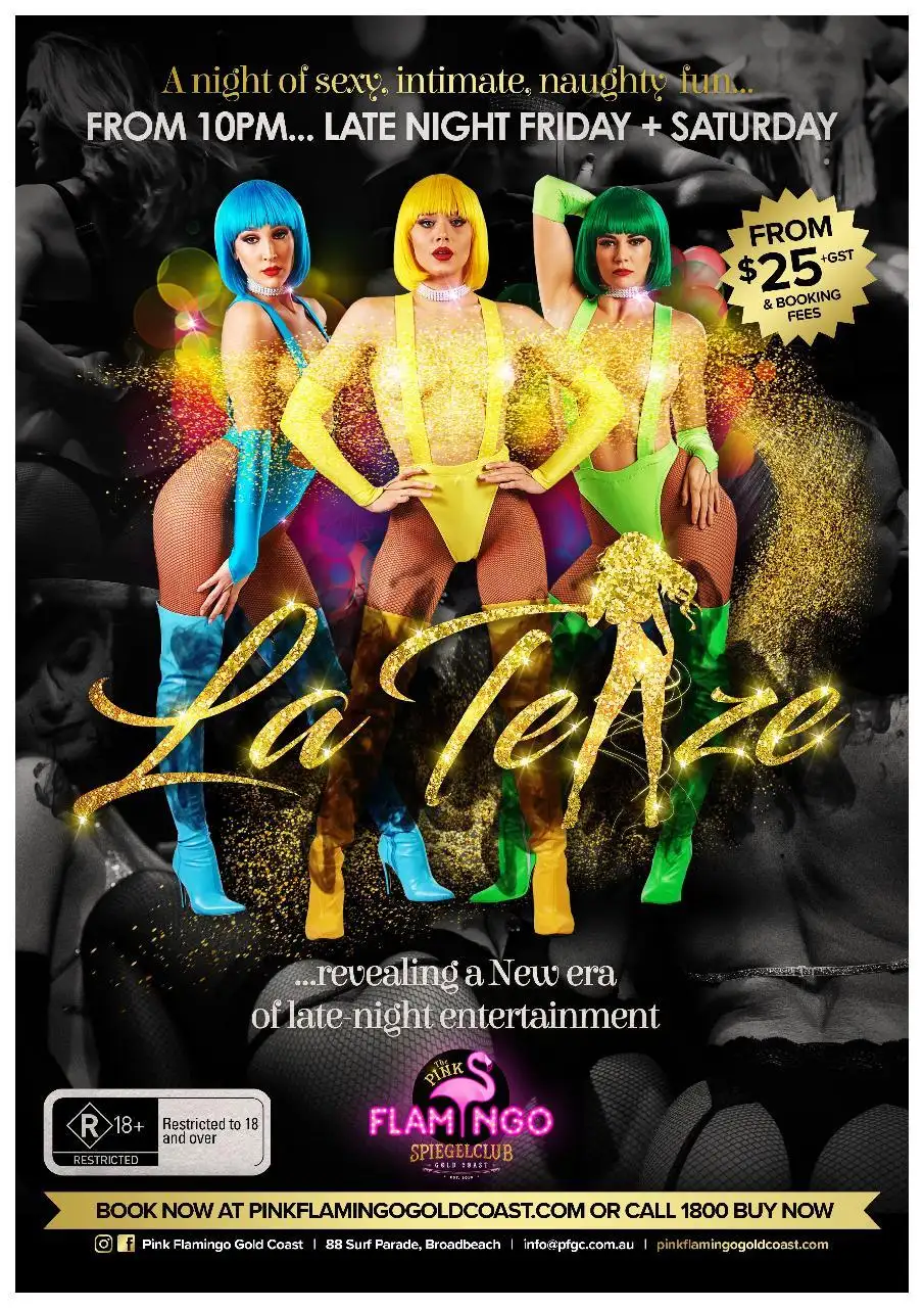 LA TEAZE is Pink Flamingo’s first Late Night experience, pushing boundaries in new styles of entertainment. Running 3 seductively sinful x 20 minute shows over the course of 2 hours, step into our R rated risque world inspired by Parisian show of Crazy Horse Paris and Moulin Rouge. Sassy and sexy, our glam girls and guys are experienced in the art of the LA TEAZE and aren’t afraid to flaunt it.