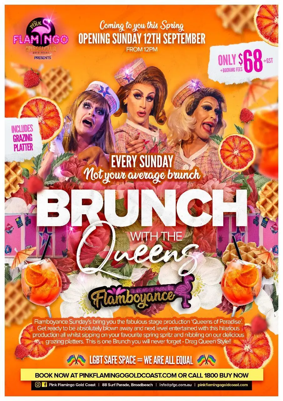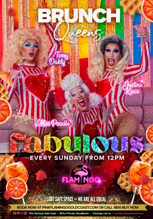 Gold Coast you’ve been asking, and we DELIVERED! The Pink Flamingo Spiegelclub Gold Coast present outrageous FLAMBOYANCE! A cast of high calibre fierce beauties, will take over the Glittering Pink Flamingo every single Sunday night! A fusion of drag, cabaret & burlesque. It doesn’t matter who you are or what you wear, only that you are there. Nest in the feathered wings of the Flamingo, a safe and inclusive space for all, because in our house WE. ARE. ALL. EQUAL. Be fabulous. Be flamboyant. Be YOU.