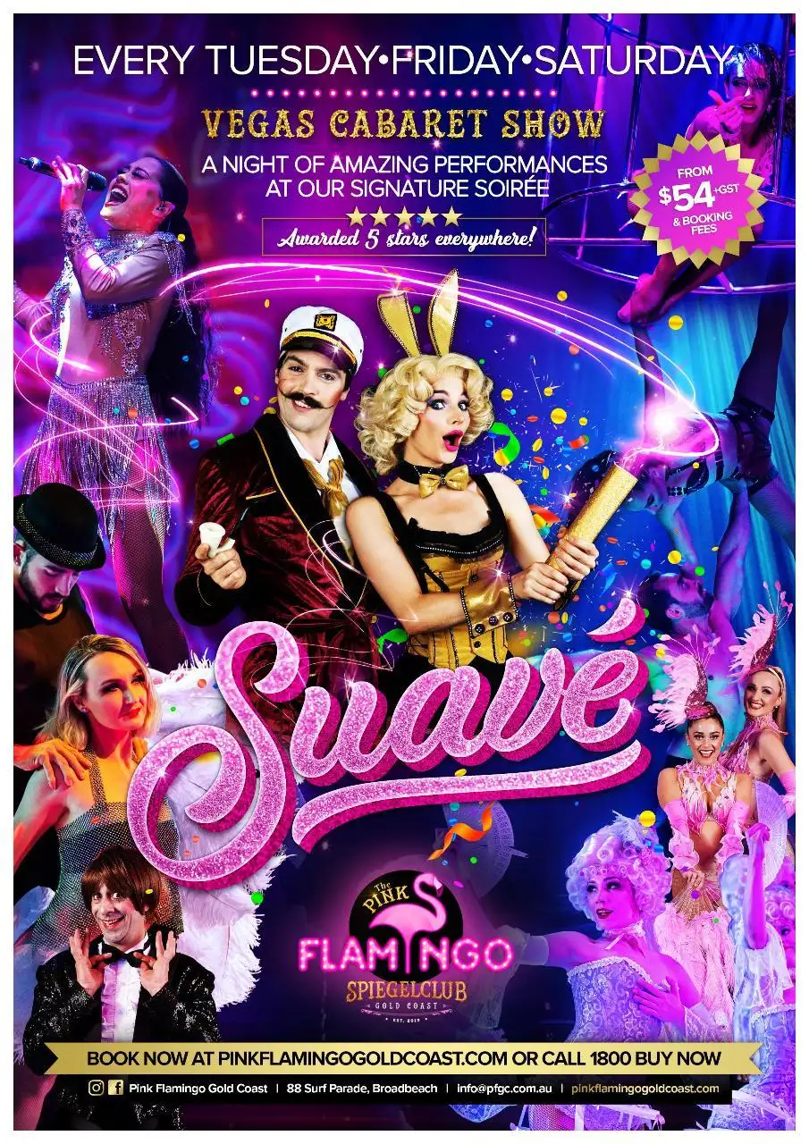The original Pink Flamingo Gold Coast stage spectacular. SUAVE is The Pink Flamingo’s resident show on the Gold Coast, running 90 minutes with a 20 minute intermission, with a touch of burlesque, a hint of Vegas and hysterical laughs in a memorable night of world class entertainment. Mind-blowing acrobatics, daring aerials feats, laugh out loud comedy, unbelievable cirque acts, singing and dancers all come together in the scandalous and saucy show!